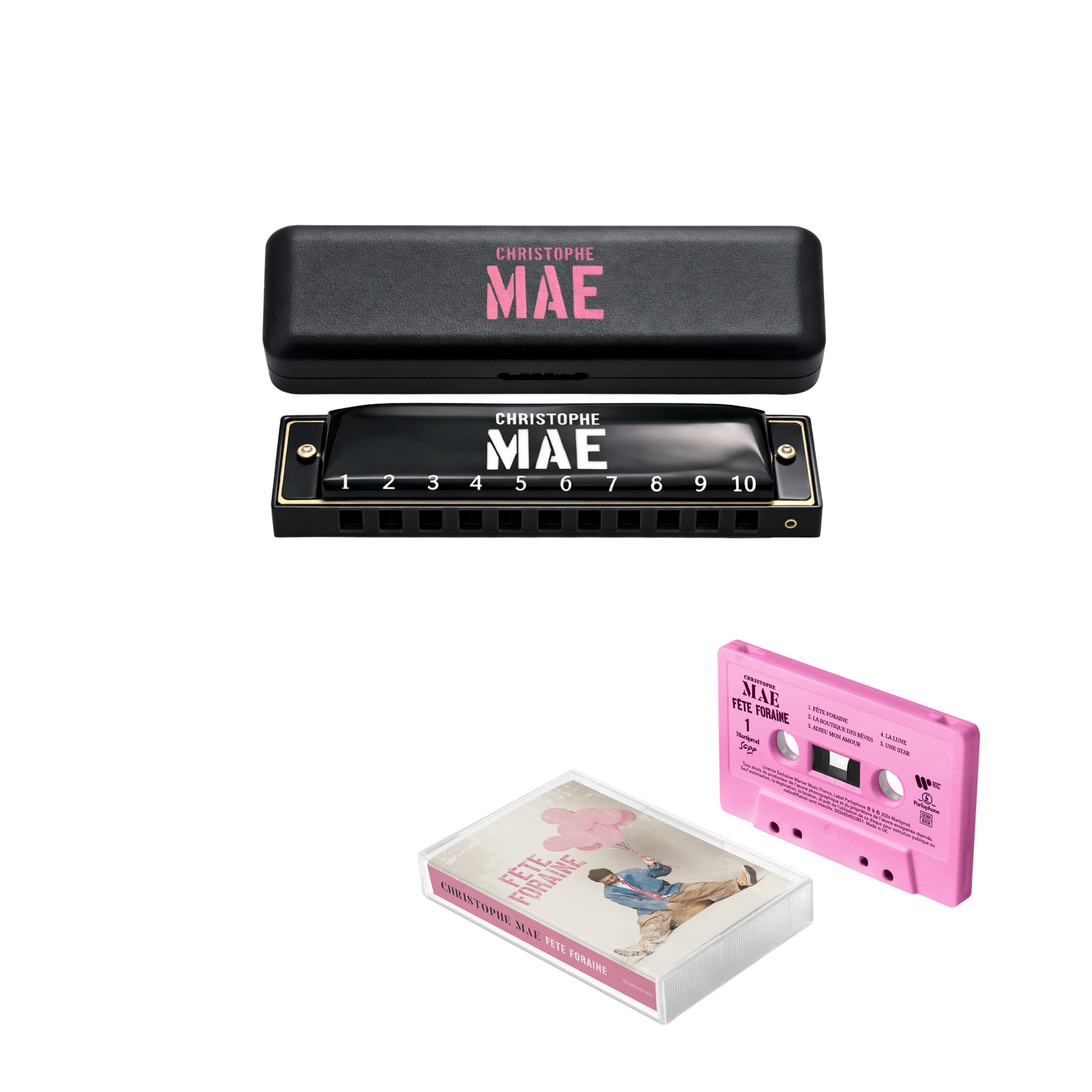 K7 - Fête Foraine + Harmonica Diatonique 10 trous de marque HOHNER Blues Band noir en Do gravé Christophe Maé.